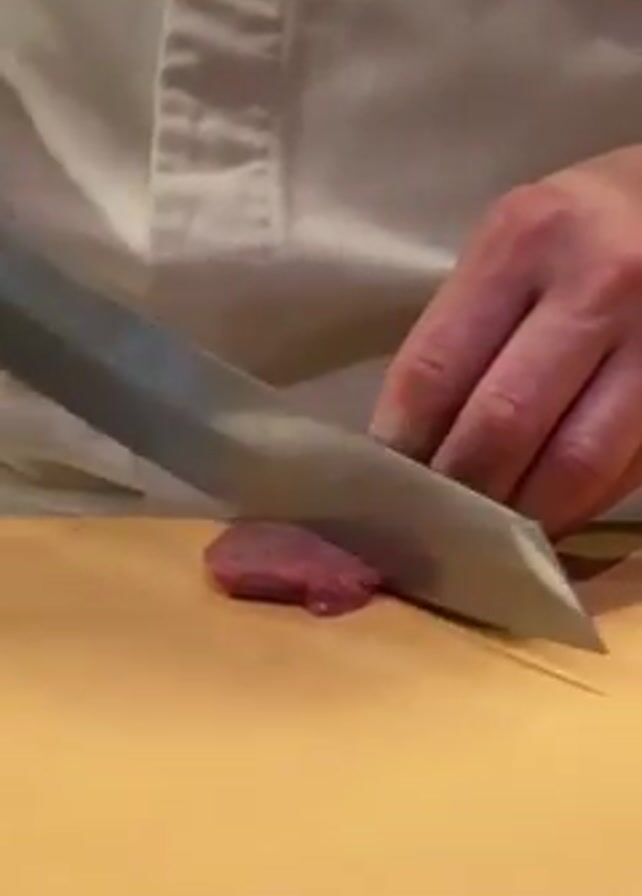 A medium shot depicts a person in a white shirt slicing a piece of red meat on a wooden cutting board