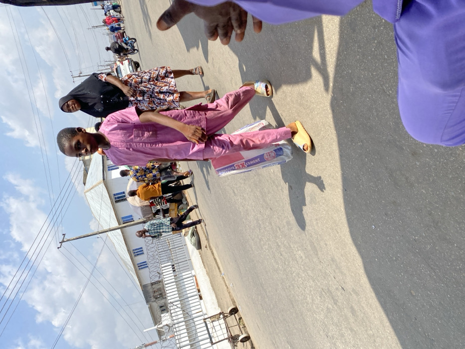 This image depicts a bustling street scene in Ibadan, Nigeria, under bright daylight