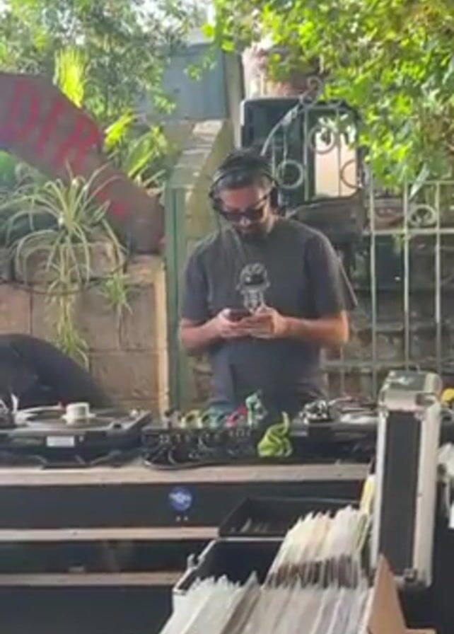 man using his smartphone while standing behind DJ equipment. He is wearing sunglasses and headphones. There are two record players, a mixer, and crates of records set up on a table. Another person is behind one of the record players, wearing black. The setup is outdoors, surrounded by trees and greenery, in what appears to be a garden or backyard setting. A sign that says "DIRT" is slightly visible in the background.