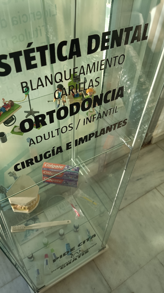 This image captures a multi-shelf, clear glass display case, consistent with a storefront or outdoor exhibition, located at a dental clinic in Sagunto, Spain
