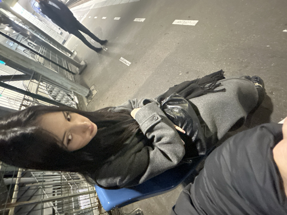A woman with long, dark hair is seated on a blue chair. She wears a grey coat and a black scarf. A shiny, dark-colored bag rests beside her. In the background, a person in dark clothing walks along a concrete surface marked with white lines. A metal fence is also visible. The overall lighting suggests an outdoor setting at night.