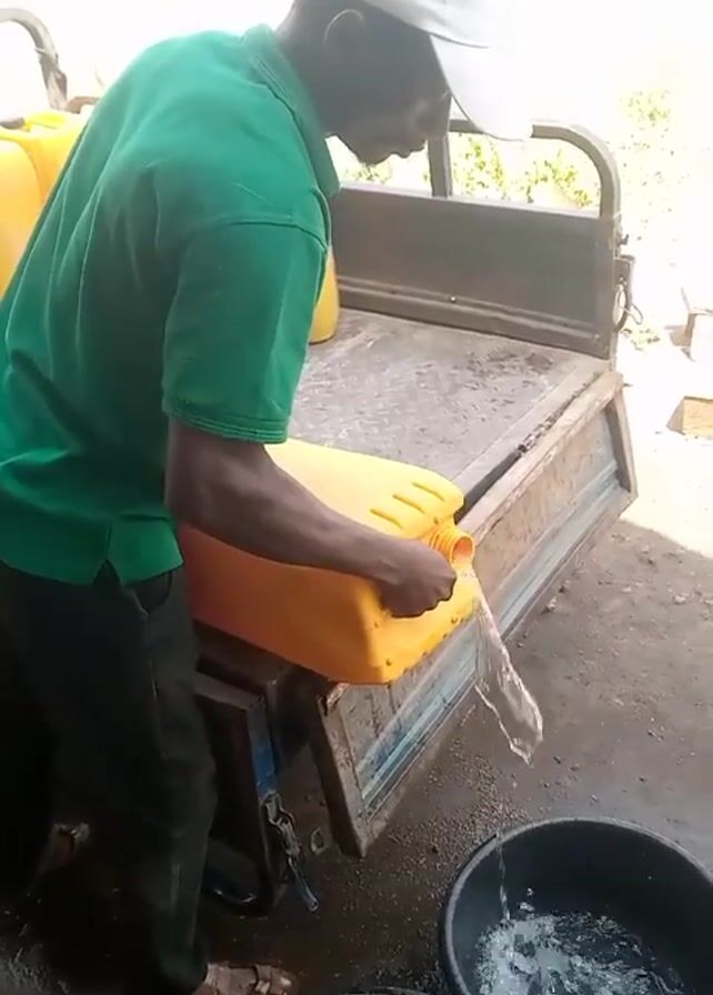 A man is pouring water from a yellow plastic jug into a black plastic basin. The man is wearing a green shirt, dark trousers, sandals, and a white baseball cap. He is standing next to the back of a small truck. The jug is on the truck's bed, and the man is using both hands to hold it and pour. There are two black basins on the ground. The ground around the basins is wet. The sky is bright, and there is vegetation in the background. A brand name "TECNO SPARK" is visible in the bottom left corner.