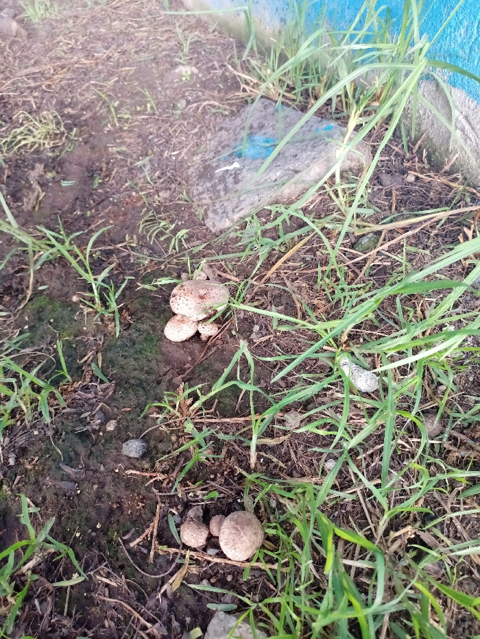 A close-up shows a patch of earth with green grass and patches of mushrooms. There's a cluster of small, round mushrooms with speckled caps and another group of round, tan mushrooms. A gray rock sits near the top with a blue patch on it. The background shows a blue wall. The ground is damp and dark with scattered bits of debris.