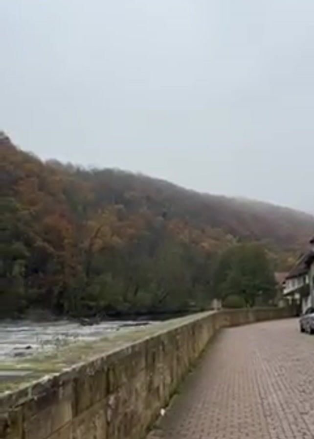 river flowing alongside a brick walkway. The river has visible rapids. On the opposite bank of the river is a hill covered with trees exhibiting autumn colors. The sky is overcast. A stone wall separates the walkway from the river. A car is parked next to a building on the walkway. The overall scene is peaceful and somewhat somber due to the weather.