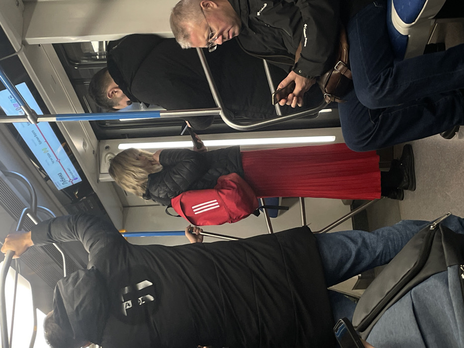 The image captures the interior of a Moscow Metro train car, specifically on the Sokolnicheskaya (Red) Line, as indicated by the digital display showing "Лубянка" (Lubyanka) and "Красные Ворота" (Krasnye Vorota) stations. Four passengers are visible within the well-lit, modern train carriage. On the far left, partially obscured, is a person in a blue jacket. Adjacent, a individual wearing a black long puffer jacket with a prominent white graphic on the back and blue jeans stands, holding an overhead silver handrail with their right hand. To their right, a blonde woman with shoulder-length hair wears a black puffer jacket, a long red pleated skirt, and black shoes. She carries a red Adidas backpack with three white stripes and is looking down at a smartphone held in both hands. Next to her, a man in a black puffer jacket leans against a blue vertical pole, also focused on a smartphone in his hands. In the foreground on the right, a seated middle-aged man with short grey hair and glasses, dressed in a black jacket and blue jeans, is engrossed in his smartphone. A brown leather satchel is visible across his lap. The train interior features white walls, a light grey floor, blue-and-white patterned seats, and a combination of silver horizontal handrails and blue vertical support poles.