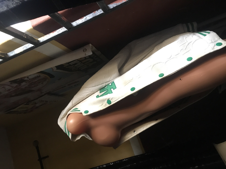 The scene is an interior location in Oba-Ile, Nigeria. A light brown, headless, armless female mannequin torso is positioned diagonally, ascending from the lower left to the upper right of the frame. A white varsity jacket, featuring green trim, green snap buttons, and green embroidered lettering (likely 'LA') on the left chest, is draped open over the mannequin torso. The upper left background shows a yellow-tan wall section with a dark horizontal rod. The upper right background displays a window secured by dark metal bars, bordering a reddish-brown wall section. Natural light enters primarily from this window. Behind the mannequin, a vertical white fabric banner with dark text, including "CHEF" and "MILK," is visible on the wall, alongside a partially obscured, faded poster. The overall illumination is dim. No individuals are present.