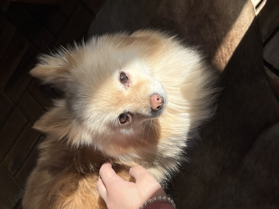 A fluffy, light-brown Pomeranian dog with a pink nose is gazing upward with dark, round eyes. Sunlight illuminates the top half of the dog, creating a halo effect. A person's hand is gently touching the dog's chest, with a pearl bracelet visible on their wrist. The dog sits on a dark brown surface. Dark shadows are visible in the background.