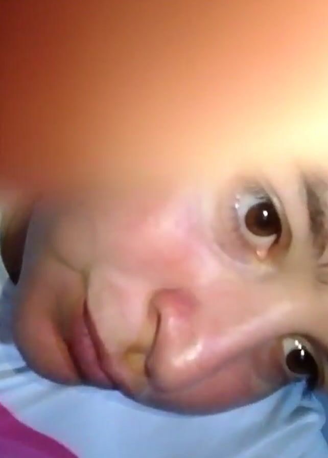 A close-up video shows a woman with light skin lying down, looking up at the camera. Her eyes are brown, and she smiles. She is wearing a white t-shirt with a pink design on it. The video has a blurry, reddish area in the top portion of the frame.