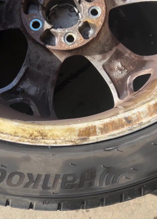 close-up view of a dirty car wheel with a tire still mounted. The wheel has a corroded, rusty appearance with traces of old tire sealant around the rim. The tire is black and wet, with the "HANKOOK" brand name visible along the sidewall. A thin layer of bubbly liquid is visible where the tire meets the wheel. The background is a concrete surface, likely outdoors.