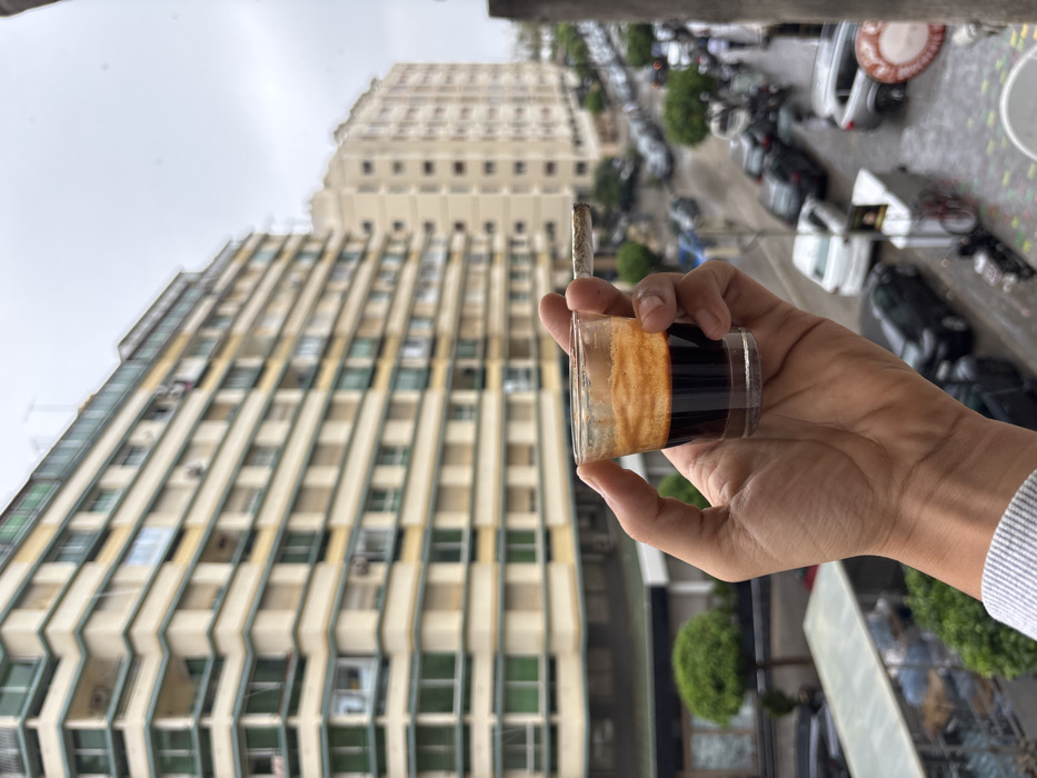 - "A light-skinned hand, wearing a light-colored striped cuff, is centrally positioned in the foreground, holding a small clear glass containing dark liquid with a thick amber crema, consistent with espresso, and an unlit hand-rolled cigarette" by FM-YEyMx1, licensed under CC BY 4.0