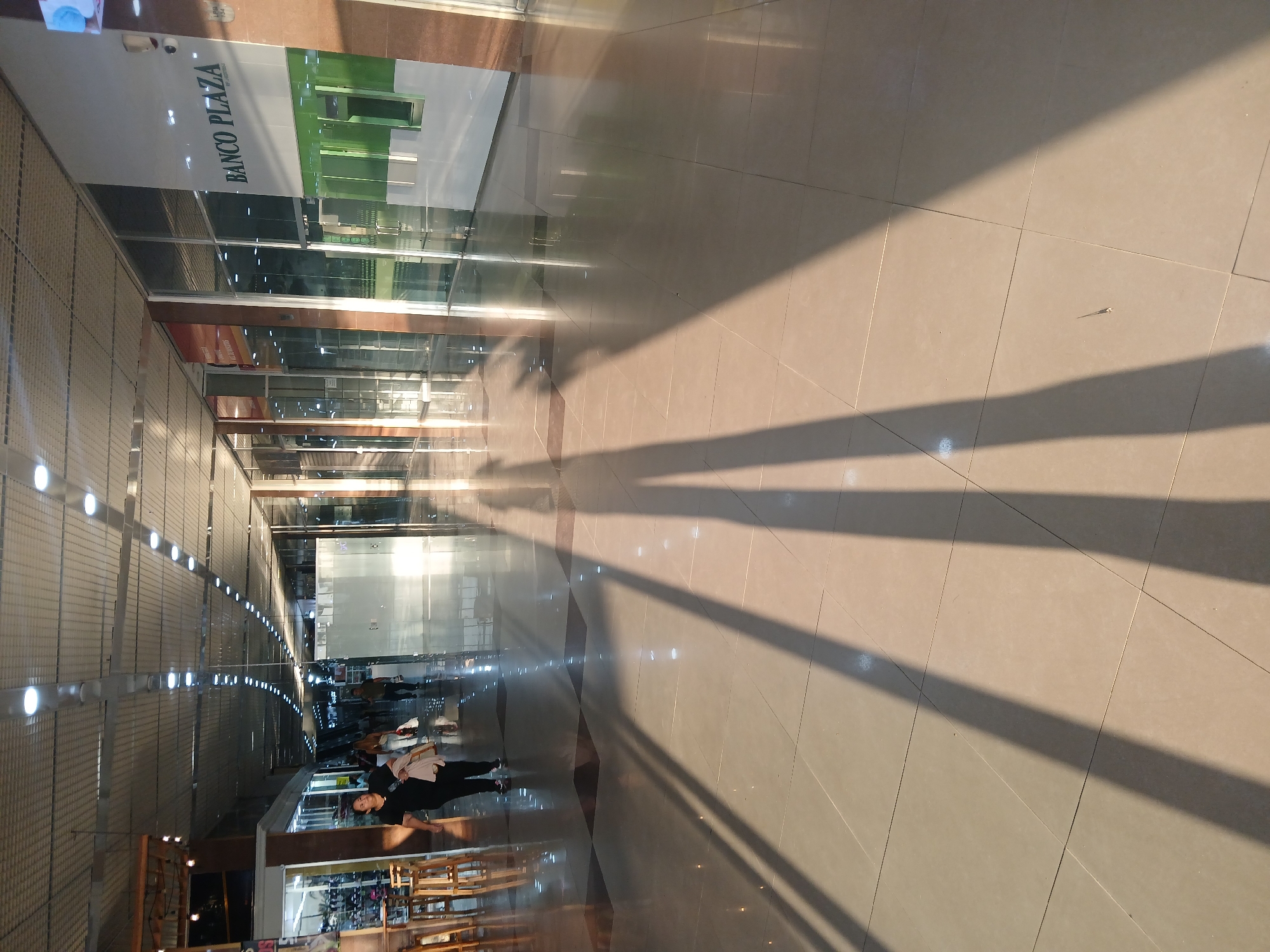 Here is a description of the image: **Location:** The image appears to be taken inside the Orinokia Mall in Ciudad Guayana, Venezuela. Banco Plaza is identifiable within the frame. **Environment:** The scene depicts an indoor mall corridor. The mall is well-lit by a combination of overhead lights and natural sunlight. The flooring is tiled. **Objects:** Visible objects include storefronts with merchandise, the "Banco Plaza" sign, and interior architectural features such as a metal ceiling grid and glass partitions. **People:** Several people are present in the mall. The shadows of individuals are visible on the floor. At least one person is visible. **Actions:** The people appear to be walking or standing inside the mall.
