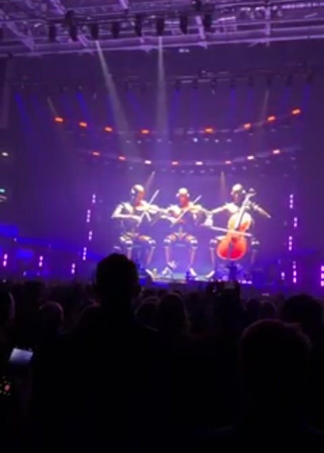 A crowd of silhouetted people is watching a concert. A large screen on the stage features a digital animation of three robotic figures playing violins and a cello. The stage is lit with purple and white spotlights. Some audience members are holding up their phones to record the performance. The environment appears to be a large indoor venue with a high ceiling.