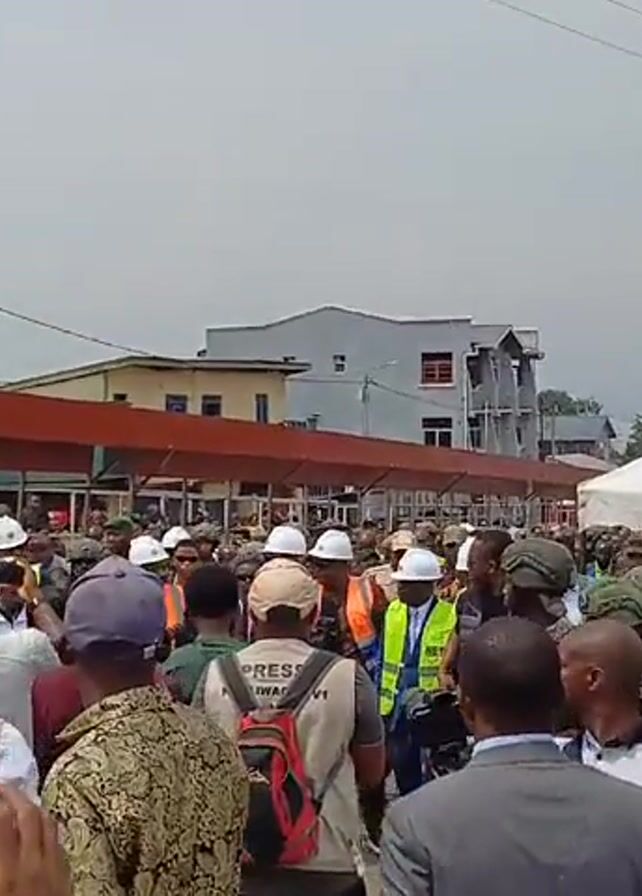 A wide-angle shot shows a crowded outdoor event on a cloudy day. The crowd consists of diverse individuals, including construction workers in hard hats and orange vests, soldiers in camouflage uniforms, people in business attire, and journalists with cameras and press identification. They are congregated around a large white tent. Behind the crowd, there is a long, partially covered structure with a rust-colored roof and buildings of various sizes in the background. A few people are holding up phones to record the event. The overall atmosphere suggests a formal event, possibly a press conference or a public address related to a construction project.