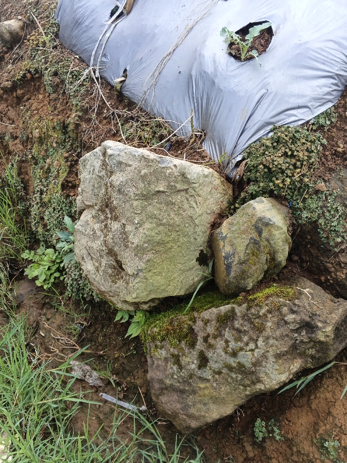 An earthscape featuring a garden bed covered with a silver plastic sheet with a seedling emerging. A collection of moss-covered rocks sits in the foreground and to the left. Weeds and grass fill in the spaces between the rocks and the edge of the plastic sheeting. The earth is moist and rich in color. A few stray plastic pieces are visible near the rocks.