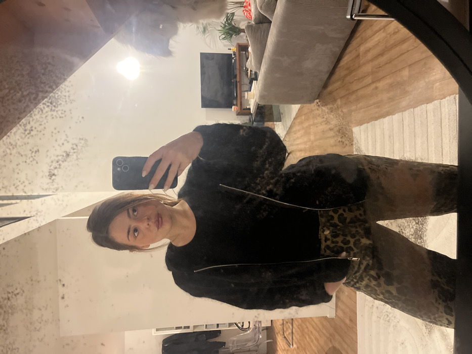 A woman is taking a selfie in a mirror. She's wearing a black jacket and leopard print pants. A grey couch, a TV, plants, and a table are reflected in the background. The mirror has an aged effect. The flooring is light wood. A white rug is partially visible.