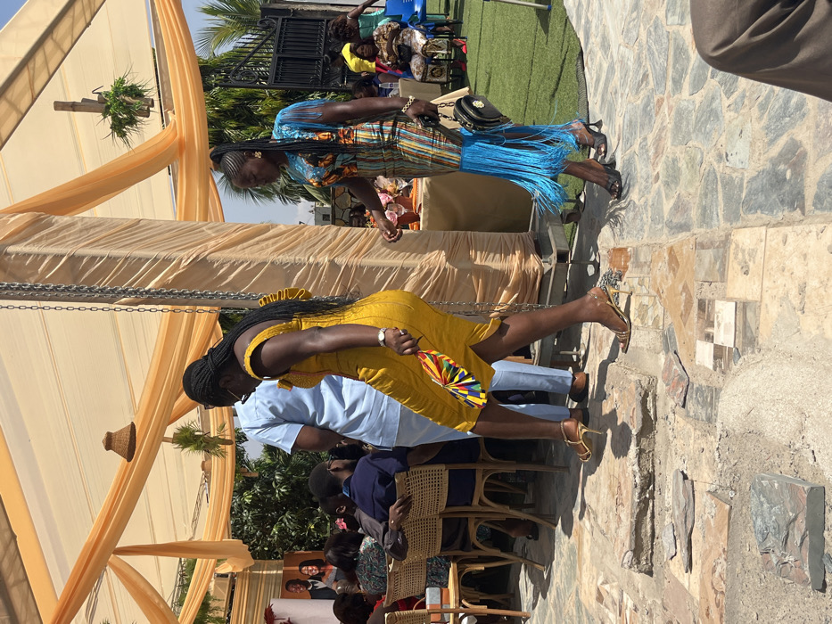 An outdoor event is depicted under a beige fabric canopy with draped orange accents, likely in Kumasi, Ghana, given the requested context