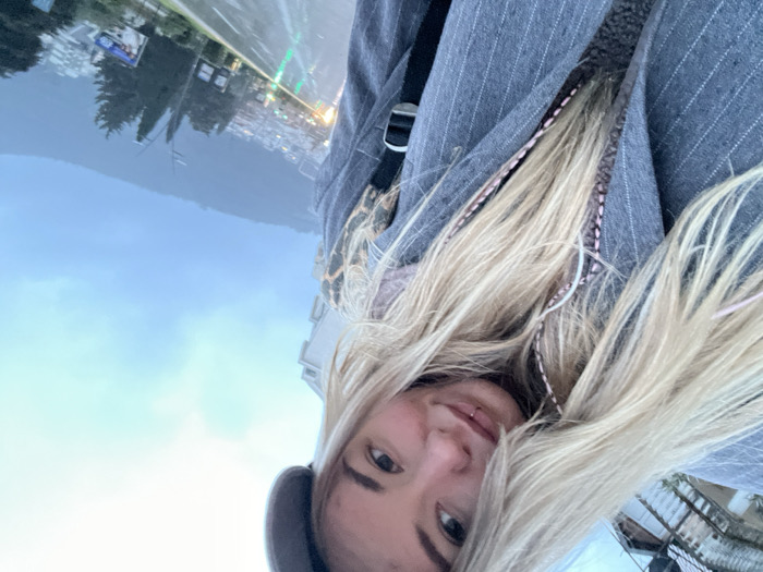 The image presents a close-up selfie of a female subject against an urban backdrop in Budva, Montenegro. The female, positioned centrally and slightly angled, has long, straight blonde hair, a fair complexion with discernible flushed cheeks, and a silver stud labret piercing below her lower lip. She wears a grey pinstripe blazer over a pink hooded sweatshirt, with the zipper open to reveal a dark, textured garment underneath. White wired headphones are visible around her neck, and a dark cap is partially seen on the top right side of her head. She is looking directly into the camera with a slight smile. The background, under an overcast, grey-blue sky, features a wet asphalt road reflecting green traffic lights and distant vehicle lights, indicative of recent precipitation. The road is bordered by evergreen trees and multi-story residential buildings, with a large, vegetated mountain range prominent in the far distance. A white building with balconies is partially visible behind the subject's head and left shoulder. A black strap, likely from a bag, is visible over her right shoulder.