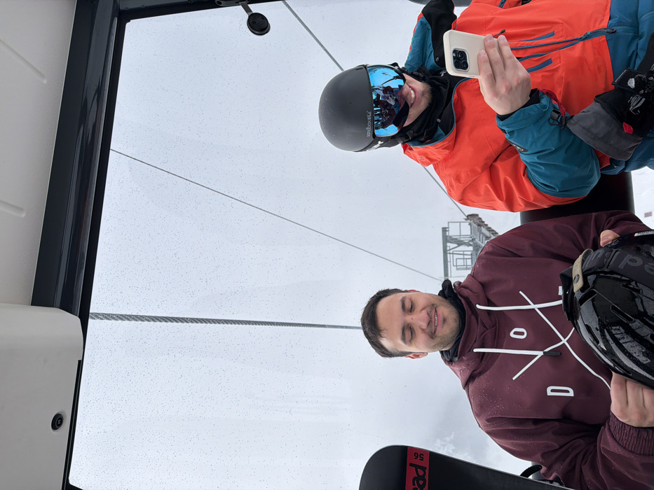 Two adult males are observed inside a ski gondola or cable car, which is in motion through an overcast and wet environment at a ski resort near Andermatt, Switzerland