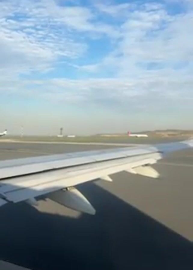view from inside an airplane, looking out the window. The airplane is on the runway, with its wing visible in the foreground. In the distance, other airplanes and airport infrastructure are visible. The sky is blue with scattered clouds.