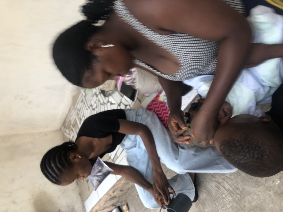 Three individuals are visible indoors. Two women focus on one who is seemingly laid back or reclined. The woman standing wears a light-colored top with dark checks. The second woman is kneeling, dressed in a black shirt and light-colored pants and is holding a dark container. The person they are attending to is mostly obscured but seems to be receiving some sort of beauty treatment or grooming. A small yellow tool is visible near their face, suggesting tweezing or plucking. The scene is casual and domestic.