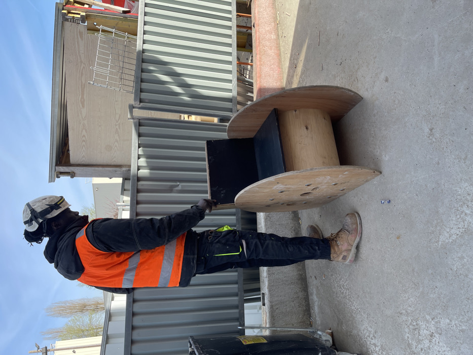 A male worker is depicted standing on a concrete surface within a construction or industrial area in Antony, France. He wears a white hard hat, a black long-sleeved top, an orange high-visibility vest with reflective stripes, black work trousers with neon yellow accents, black gloves, and brown work boots. His right hand rests on the top edge of a repurposed wooden cable spool, which has been modified into a chair with a black seat and backrest. The ground shows minimal debris, including small blue objects. In the midground, a corrugated metal fence serves as a barrier. Beyond the fence, a wooden structure resembling a shed or storage unit is visible, along with some metal grating. Further in the background are light-colored industrial buildings and bare trees under a clear blue sky.