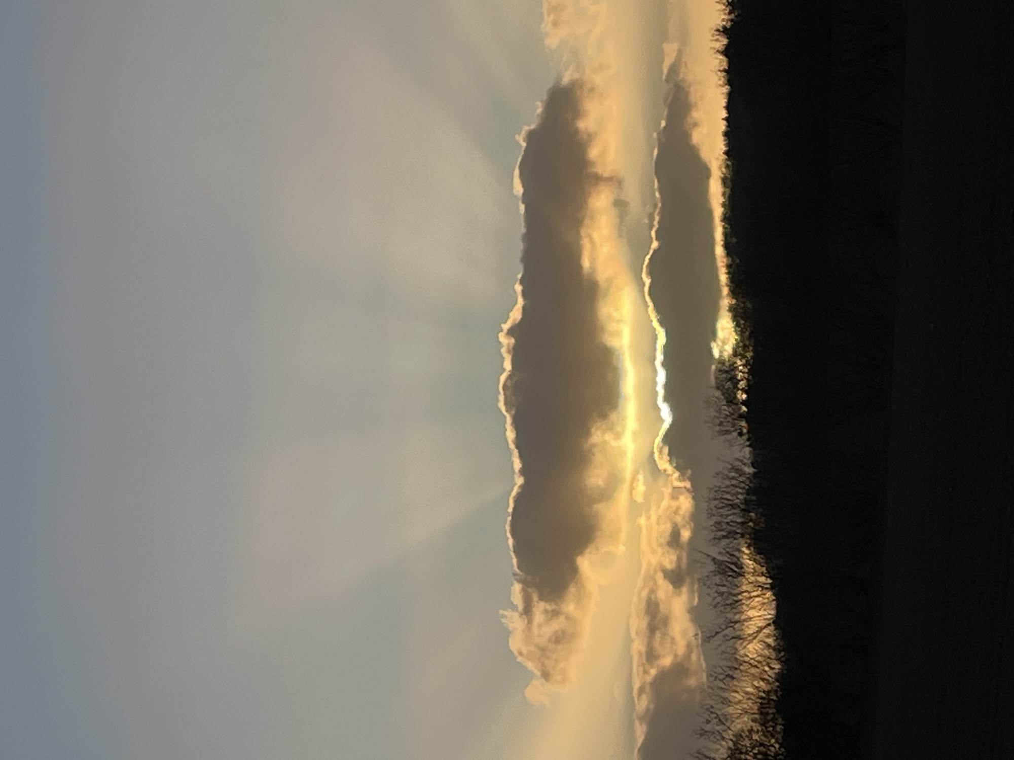 sky at sunset or sunrise. The sky is mostly clear on the left side of the image, with a pale blue-gray color. On the right side of the image, there are two prominent cloud formations with radiant golden light shining through gaps in the clouds. These clouds have dark edges and irregular shapes. The light appears to be emitting from behind the clouds, creating a halo effect. The tops of silhouetted trees or a treeline are visible at the bottom right of the image; the treeline has a dark, indistinct form. There is a dark area beyond the treeline, that could be a field. It is not possible to determine the specific location in Vejle, Denmark. There are no people visible.