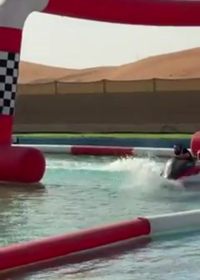 person driving a small, black and red watercraft on a pool with inflatable red and white barriers. The person is wearing a black helmet and clothes. The pool is located in a desert-like environment with sand dunes and sparse vegetation. The watercraft is making waves as it moves through the water, maneuvering around the barriers. The background shows a light sky, suggesting it is daytime.