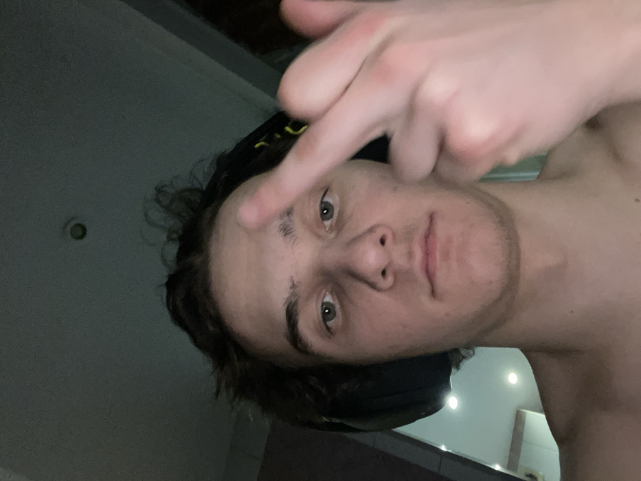 The image displays a close-up, chest-up portrait of a young adult male indoors. The male, exhibiting a light complexion, dark wavy hair, and light-colored eyes, faces the camera directly with a neutral facial expression. He appears shirtless, with portions of his shoulders and upper chest visible. Dark, over-ear headphones are worn on his left ear. His right hand is raised in the foreground, with the middle finger extended vertically, conveying a gesture of defiance or insult; this hand shows slight motion blur. The background features a dark ceiling with a circular, dark fixture, possibly a smoke detector or small light, visible near the top center. On the left side of the frame, several recessed downlights emit bright white light, illuminating a light-colored wall or surface. The overall environment is dimly lit, with the subject partially illuminated by artificial light. The specific location within Krasnoyarsk, Russia, cannot be determined from the visual evidence in the image.