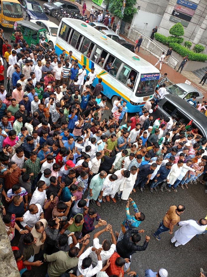 This image depicts a large street gathering or protest on a commercial thoroughfare in Dhaka, Bangladesh. Hundreds of adult males, primarily dressed in casual South Asian attire, densely pack the asphalt road, obstructing vehicular traffic. Many individuals are seen with raised arms and fists, indicating vocal participation. Security personnel in dark uniforms are visible on the elevated sidewalk of a commercial building to the right, which features signs including "DAAGA MAN" and "earth." A white and light blue public bus is stationary amidst the crowd on the left, with Bengali script visible on its front. A black sedan is also halted on the right, and a Bangladeshi flag is visible near its window. Other vehicles, including a yellow truck, a blue car, motorcycles, and a green auto-rickshaw, are stalled further down the street. The scene is illuminated by diffused daylight under an overcast sky, showing a significant urban disruption.