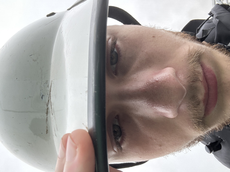 A low-angle, close-up selfie depicts a person wearing a white helmet