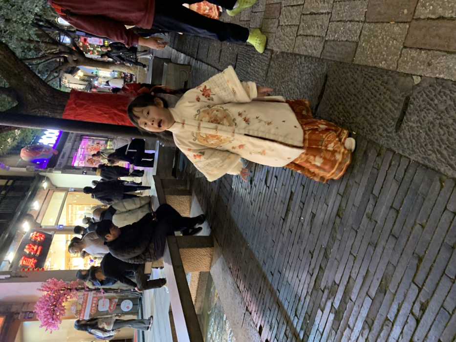 A young child is centrally positioned on a dark brick-paved sidewalk in a commercial area of Shangcheng District, China, at night. The child, with dark hair styled in pigtails, wears a cream-colored, long-sleeved jacket featuring a mandarin collar, frog closures, and embroidered floral and circular patterns, over a patterned orange and brown skirt, and white shoes. Her mouth is open, and her arms are slightly outstretched as she faces the viewer. To the left, a narrow water channel runs parallel to the sidewalk, partially covered by a stone bench. Several individuals are seated on or standing near this bench, including a man in a black jacket looking downwards. Behind them, an illuminated storefront with large display windows shows Chinese characters, including "真丝坊" (Silk Workshop), and is adorned with a pink artificial cherry blossom tree. To the right, a large tree trunk wrapped in red fabric stands near another brightly lit storefront. Multiple pedestrians are visible in the background, including a man partially seen on the far right wearing a red jacket and neon yellow-green shoes. The scene is illuminated by artificial light sources from storefronts and street fixtures, casting shadows on the paved ground.