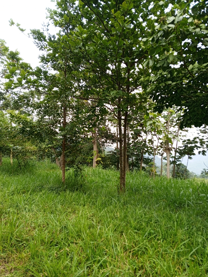The image depicts an outdoor, natural landscape located in Thotagamuwa, Sri Lanka. The foreground consists of dense, overgrown green grass. In the midground and extending into the background, numerous trees with brown trunks and vibrant green foliage are visible. The trees vary in height and density, suggesting a wooded or semi-forested area. A distant elevated landform, possibly a hill or mountain range, is visible on the horizon beneath a bright, possibly overcast, sky. No individuals, animals, or man-made structures are present within the frame. The scene is static, under natural daylight conditions.