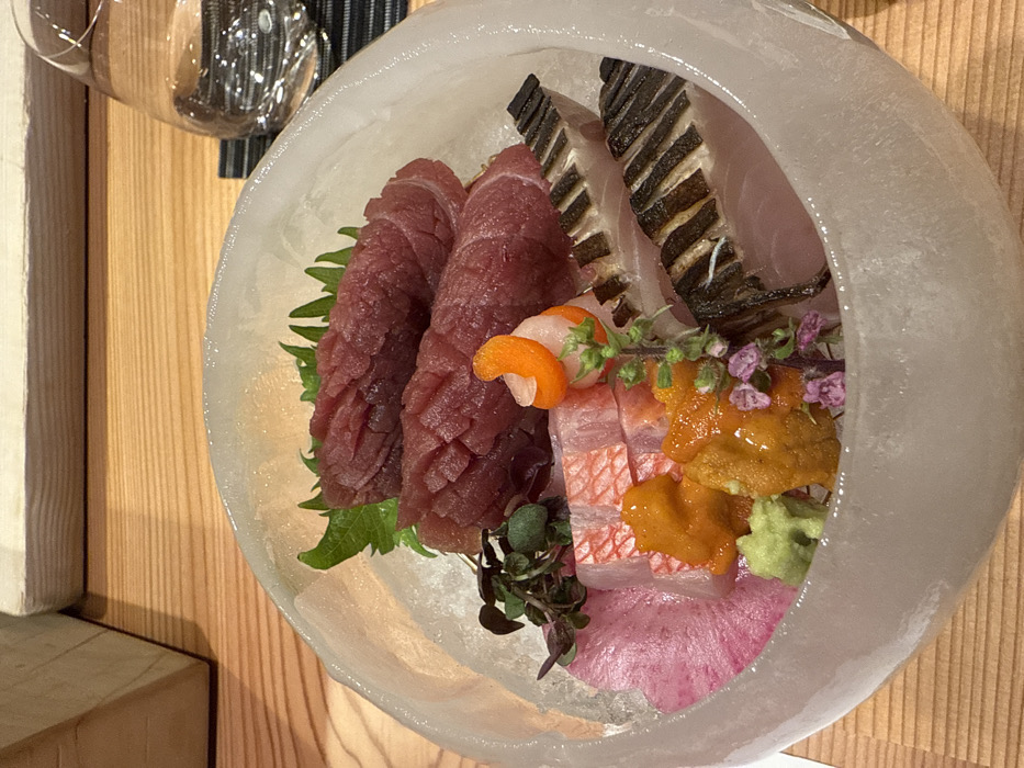 An overhead view captures a finely presented sashimi and seafood dish served in a clear, textured, ice-like bowl, positioned on a light wooden table