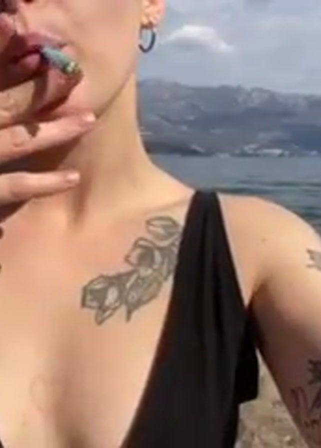 A close-up shot shows a person with short hair, sunglasses, and a black top standing on a beach. They are smoking a cigarette or joint, and have several tattoos visible on their chest and arms. The beach has a rocky shore, and in the background is a body of water with mountains visible in the distance. The sky is mostly clear with some clouds.