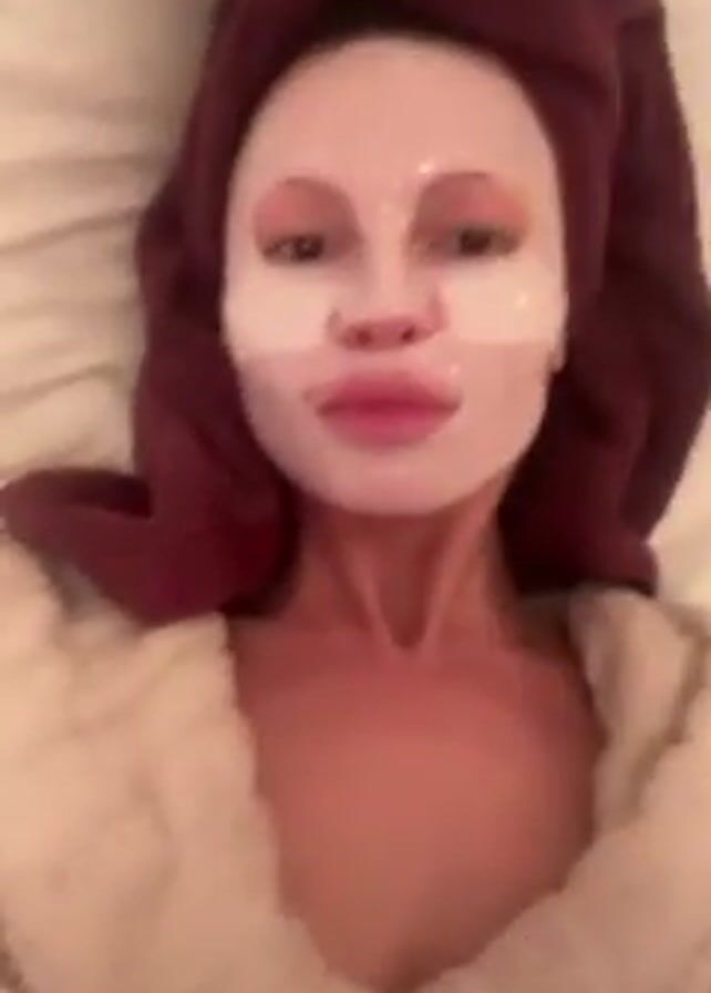 A woman with a sheet mask on her face lies on a bed, wearing a terry cloth robe and a maroon towel wrapped around her head. The camera zooms in on her face. She appears relaxed. The background is a white bed.