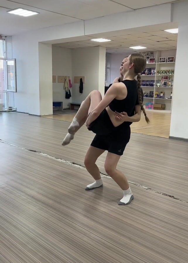 Two young women in black athletic wear and white socks are in a dance studio with wood flooring. One lifts the other over her head and flips her, catching her as she comes down into a kneeling position. Then, the person who was kneeling stands up and faces a mirror, where she raises her arms in a wide arc, smiling. The other woman mirrors the movement.