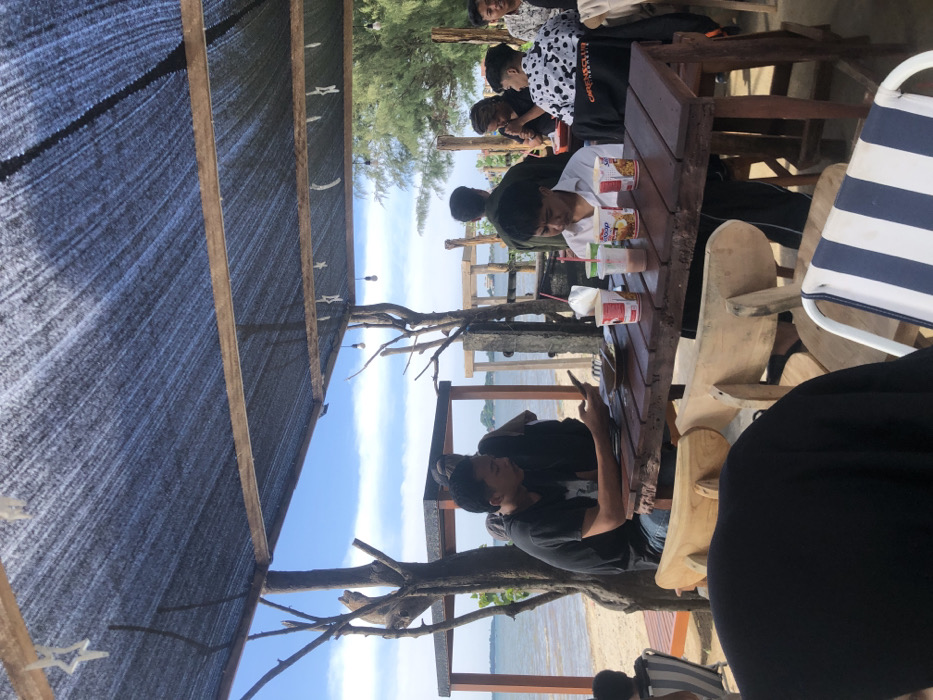 People are seated at a wooden table, eating what appears to be instant noodles. A wooden structure covered with black mesh provides shade. The scene unfolds near a beach, with the ocean visible in the background. Some individuals are using their phones. The table is cluttered with food containers and cups, indicating a casual meal setting. A blue and white striped chair is visible on the right, and trees frame the view towards the ocean.