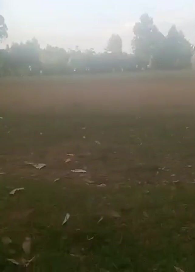The camera pans across a grassy field towards a line of trees. A few people are visible in the distance along the tree line. The sky is overcast and the light is diffused. There are some pieces of debris on the ground in the foreground. The camera lens is partially obscured by a finger.