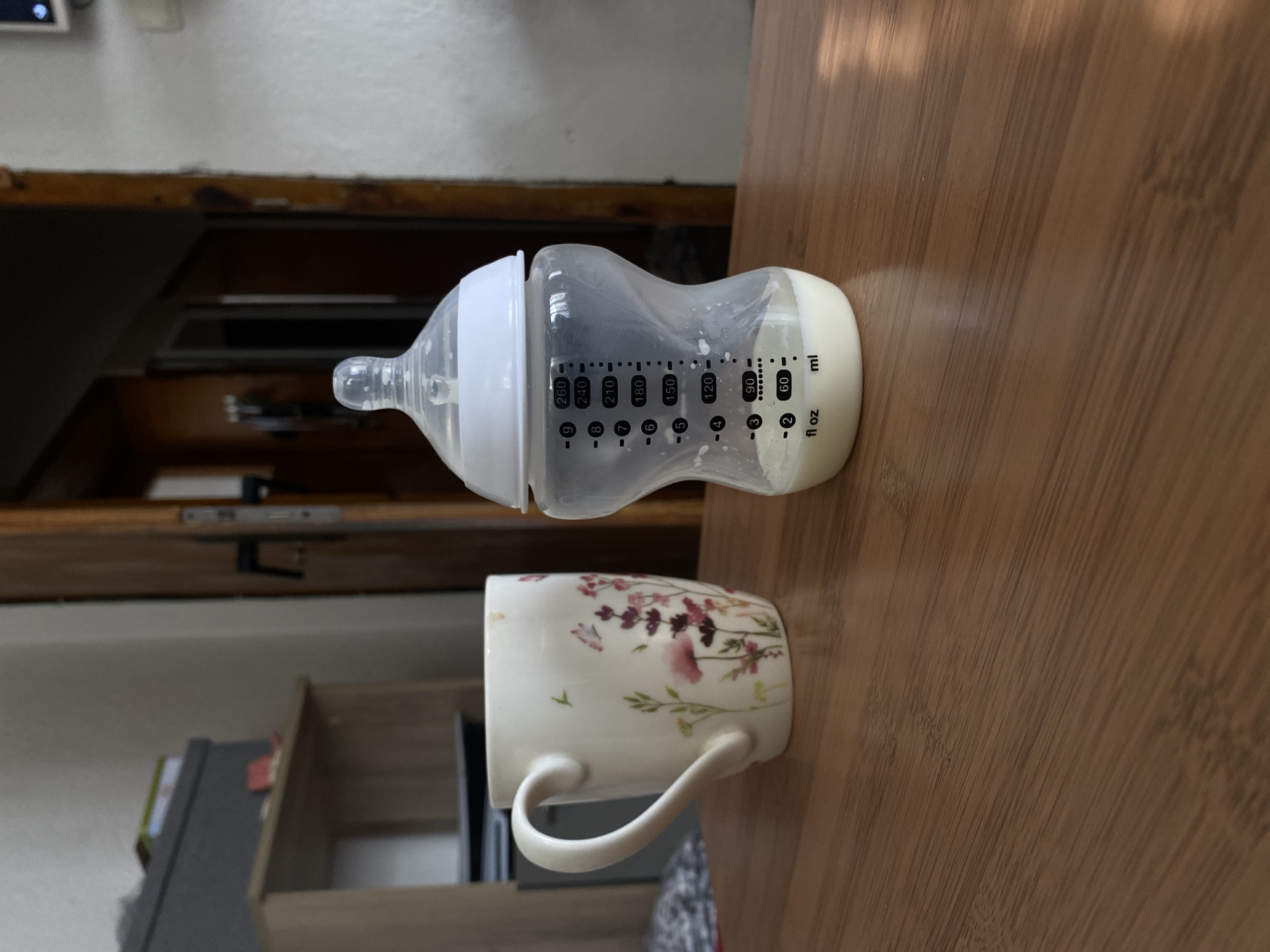 - "baby bottle with milk in it next to a mug with a floral pattern" by FM-tB4Kn2, licensed under CC BY 4.0