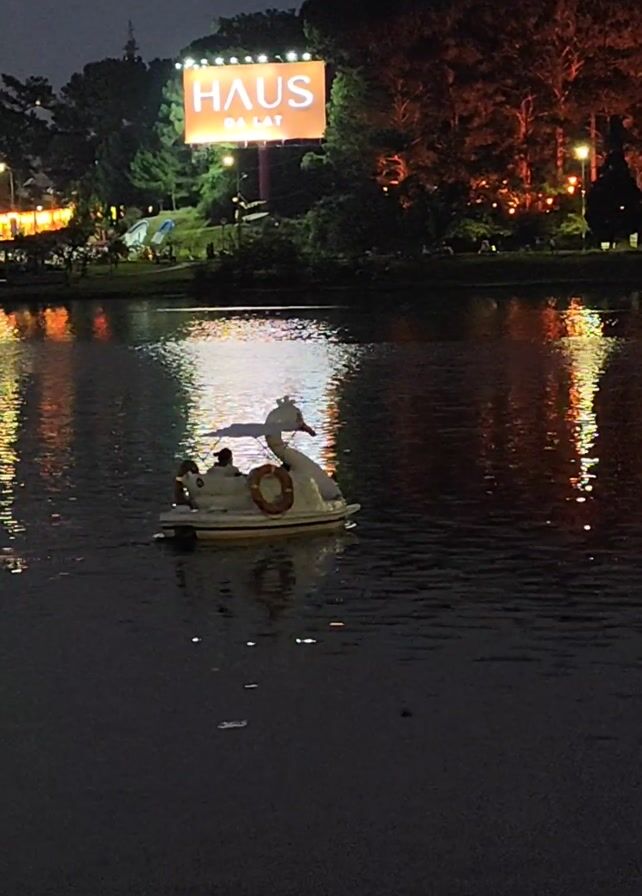 At night, a swan-shaped paddleboat is on a lake. The boat is white with a yellow life preserver and holds one person. Reflections of lights are visible on the water. In the background, there's a large illuminated sign that reads "HAUS DA LAT," as well as trees and other lights along the shoreline. The overall scene is dark, with the lights providing a glow and highlighting the main subjects.