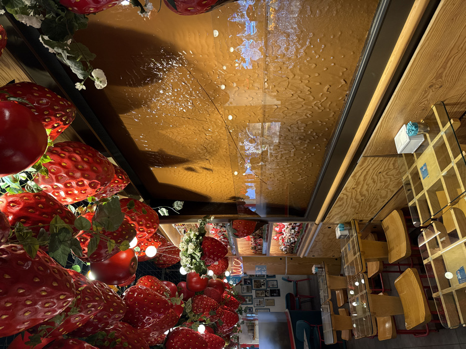 The image depicts the interior of a themed dessert cafe or restaurant located in Kadıköy, Turkey. The overhead space is extensively decorated with numerous oversized, artificial red strawberries suspended from the ceiling, interspersed with green foliage and small spherical lights. Some red spherical objects, possibly apples, are also visible among the strawberries. A prominent feature on the right side of the room is a large, vertical, rectangular chocolate waterfall display encased in glass. Melted, medium-brown chocolate continuously flows down a textured, vertical surface within the display. Reflections of the room's interior are visible on the glass surface of the waterfall. The seating area in the foreground and extending towards the left features multiple tables with clear glass tops supported by light wooden bases. Several tables incorporate a grid or compartmentalized design in their glass tops. These tables are accompanied by light brown wooden stools with visible red metal frames. Below the chocolate waterfall display, the wall is paneled with light-colored wood. In the background on the left, additional seating is visible, along with a wall featuring a gallery of framed pictures. A white neon sign displaying "WC" is affixed to a wooden pillar. Shelves below this area display numerous small figurines, predominantly in red, along with a large, stylized strawberry decoration. The cafe is illuminated by warm artificial light sources. No individuals are present in the scene.
