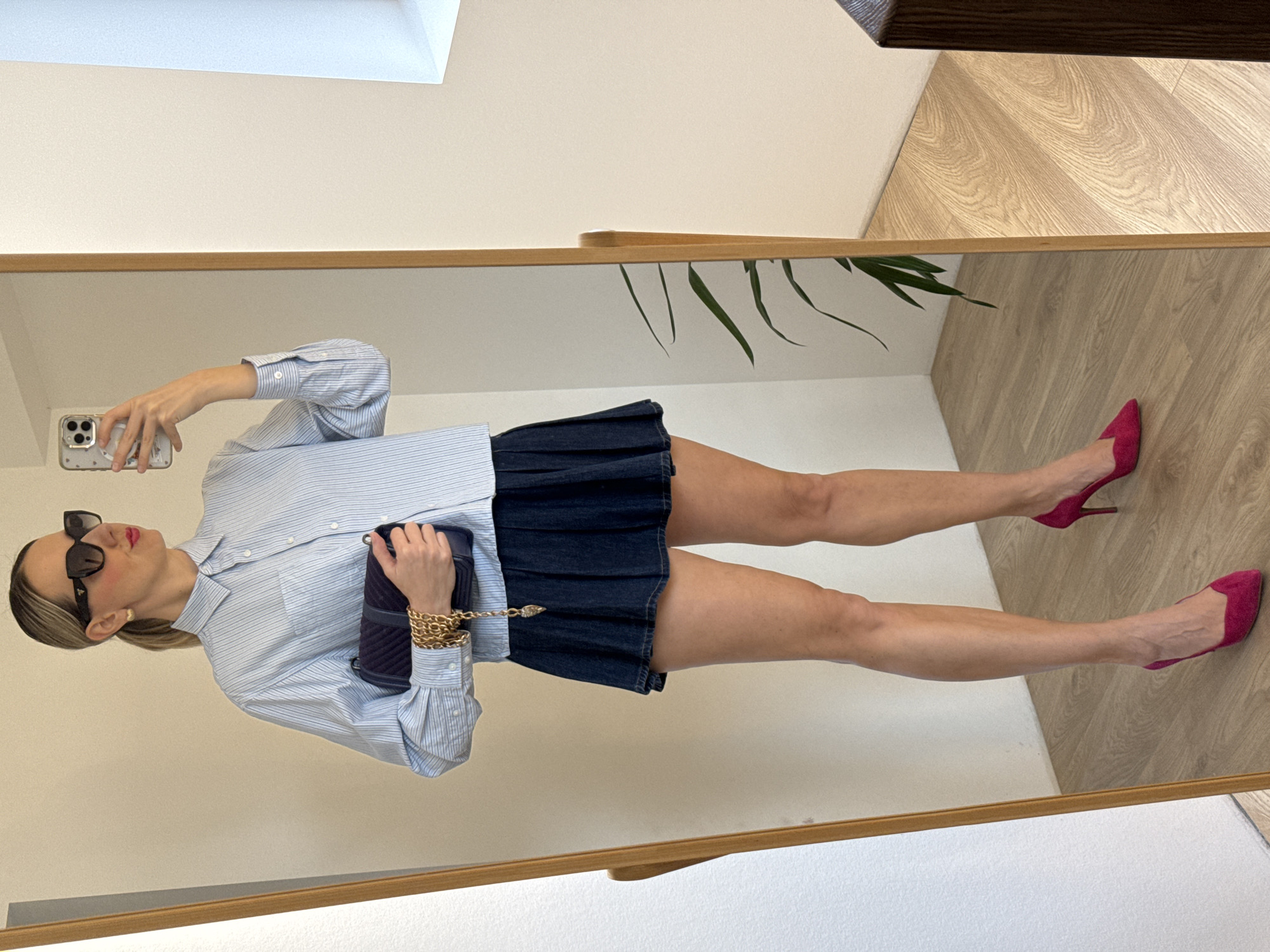 A woman is visible in a mirror reflection, taking a selfie with a smartphone. She's wearing a light blue striped shirt, a short dark-blue pleated skirt, and bright pink high-heeled shoes. She's also wearing sunglasses and holding a dark purse with a gold chain. The environment includes a cream-colored wall, light wooden flooring, and a plant, potentially indicating an indoor space. Carnikava, Latvia is not apparent from the image.