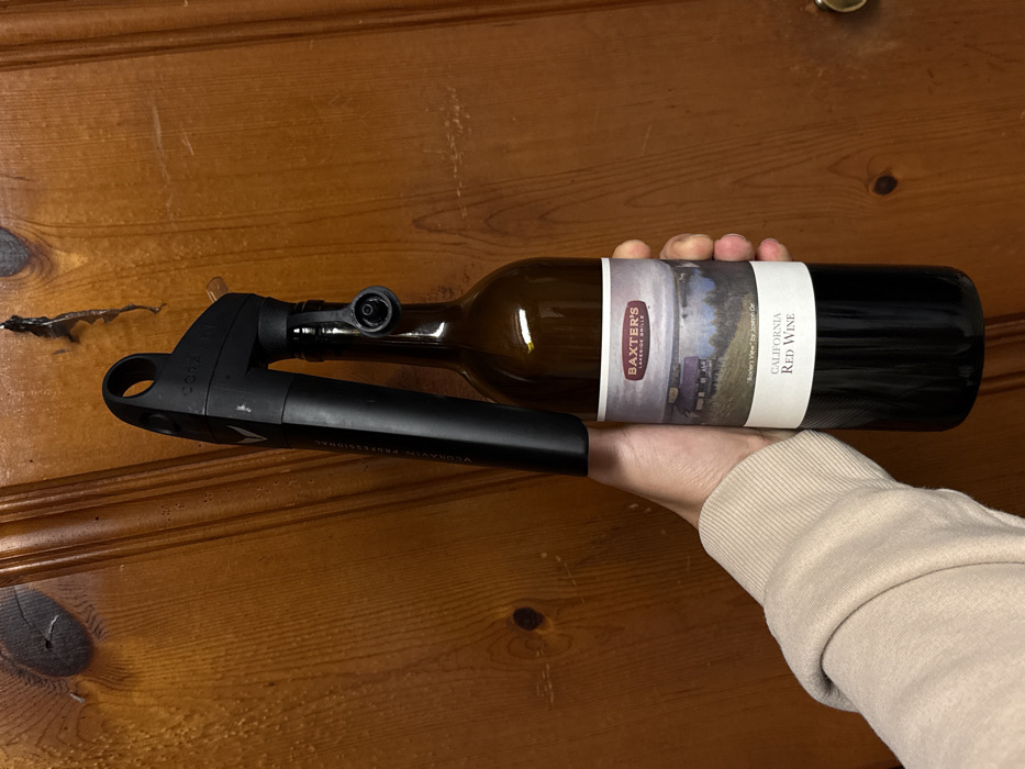 - "A Coravin wine preservation system is attached to a bottle of "Baxter's Lakeside Grille" California Red Wine" by FM-EQHYk2, licensed under CC BY 4.0