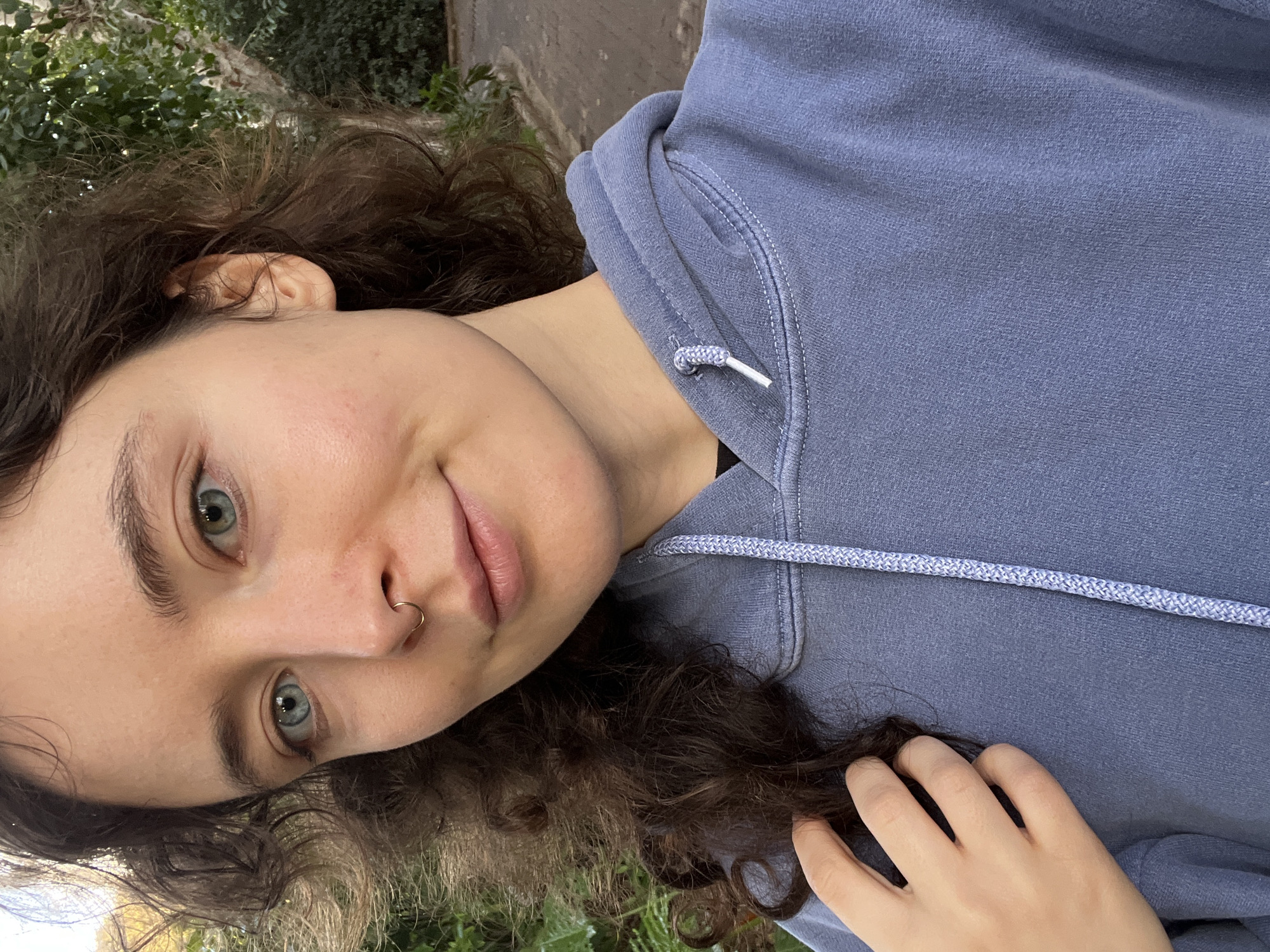 An image captures a head-and-shoulders portrait of a young female in an outdoor setting in Ramat Gan, Israel. The subject has fair skin, blue-green eyes, dark brown curly hair, and a subtle smile. A small, gold-colored hoop piercing is present in her left nostril. She is wearing a faded periwinkle or light blue hooded sweatshirt with a visible braided drawstring featuring white plastic tips. A black garment is partially visible beneath the sweatshirt collar. The subject's left hand is positioned with fingers resting near her left shoulder and neck area. The background consists of green foliage from trees and bushes, with a light-colored paved path visible in the upper right. Natural daylight illuminates the scene. The subject is looking directly at the camera.