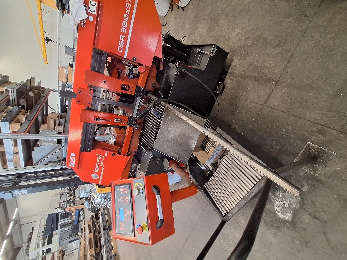 The image depicts an industrial workshop in Simitli, Bulgaria, focusing on an orange Karmetal OSA 300x370 horizontal band saw