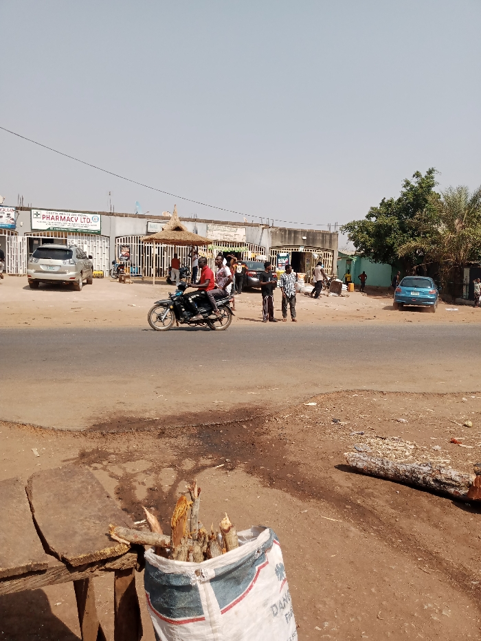 This image captures a street scene in Rido, Nigeria, under a clear, pale sky