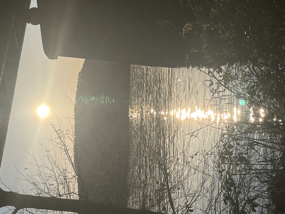 The image depicts a riparian scene in Konz, Germany, illuminated by low-angle sunlight, consistent with either sunrise or sunset. A large body of water occupies the central and lower portions of the frame, across which a prominent, vertical path of intense sun glint and sparkle is visible on the rippled surface. In the background, a dark, tree-covered hillside spans the horizon beneath a bright sky. The foreground left features the silhouetted trunk and bare, slender branches of a deciduous tree. On the foreground right, a substantial, dark, vertical concrete pier, consistent with a bridge support, rises from the water's edge and extends upwards, partially obscuring the scene. A dark horizontal structure, likely the underside of a bridge, is present along the top edge of the frame. Sparse, dark, wild vegetation is visible along the immediate shoreline in the lower foreground. No individuals are present within the scene.