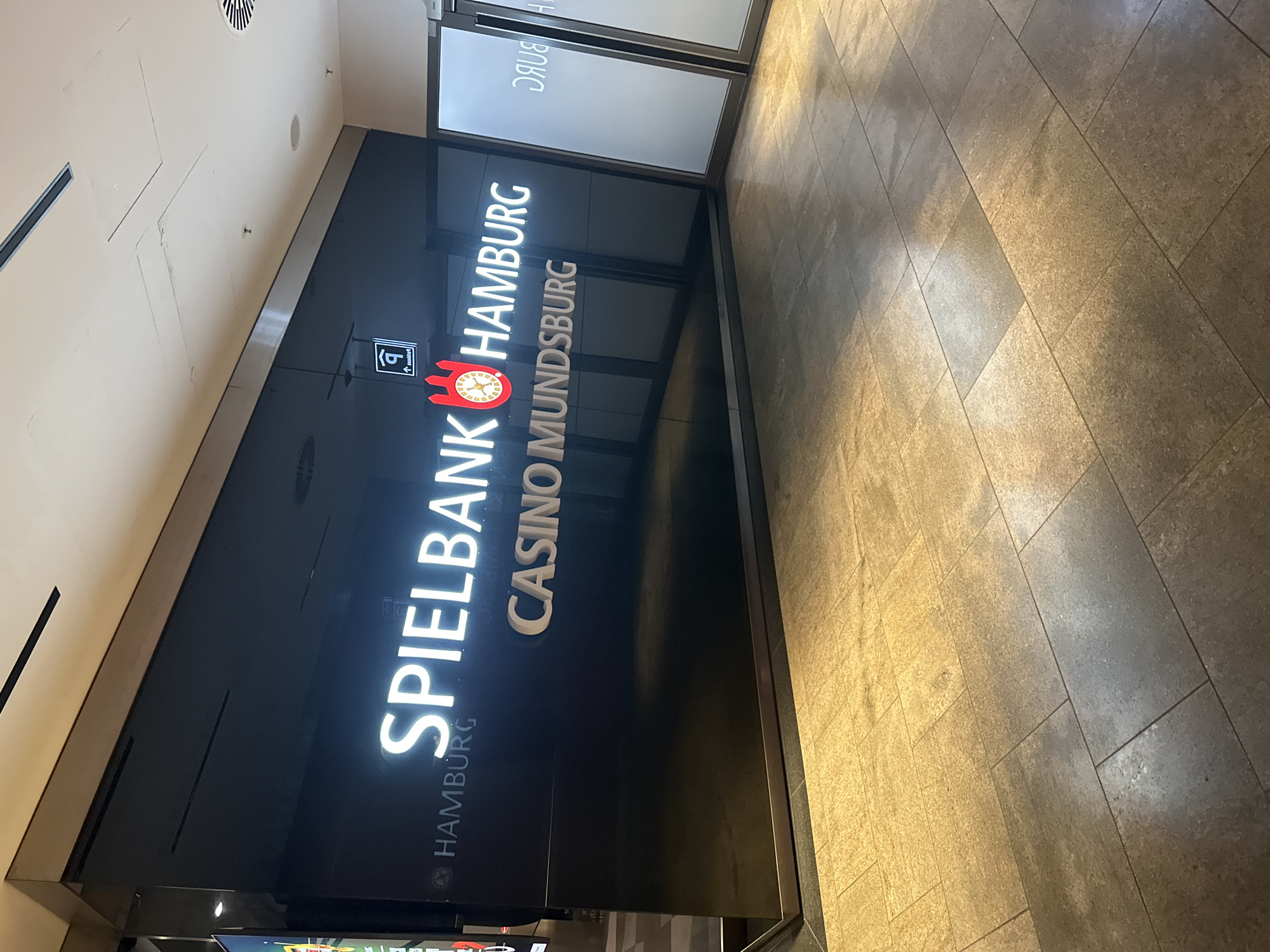 An indoor, eye-level photograph captures the entrance to a gambling establishment in Hamburg, Germany