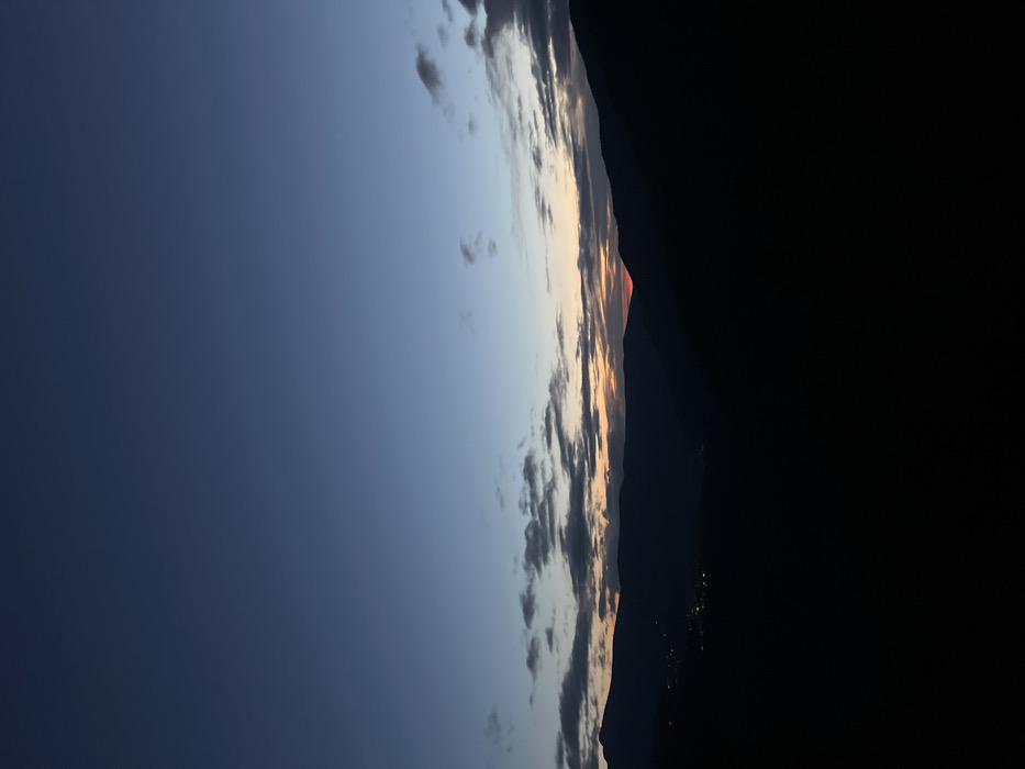 A twilight sky transitions from deep blue to soft hues near the horizon where a mountain range is silhouetted. Wispy clouds dot the sky, reflecting the sunset colors. Tiny lights indicate a village nestled along the mountain base. The right side of the image is dominated by a stark, dark mass, contrasting with the illuminated sky and mountains.