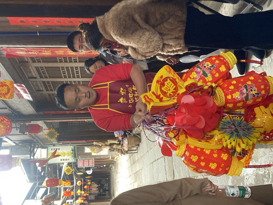 A man wearing a red shirt and a brown apron is holding a bunch of colorful lanterns and paper decorations. He appears to be a vendor in a traditional Asian market or street. Other people are visible in the background, including a woman in a brown coat. Red banners hang overhead. The scene is a busy outdoor setting with a variety of shops and stalls lining a narrow street.